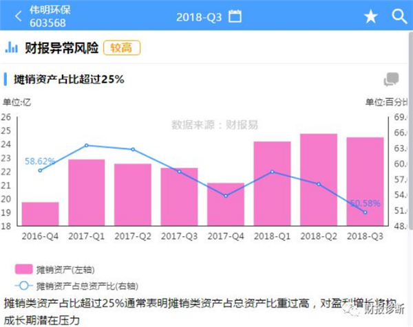 這兩天有網友在質疑偉明環(huán)保的一些問題,筆者翻看了財報易上對偉明環(huán)保所做的財務診斷報告,就下列財報易所發(fā)現的兩個問題跟大家交流一下。1、偉明環(huán)保攤銷資產占比為何那么高?從財報易提示的風險中,偉明股份的攤銷資產占比高達50%,查看公司2018年三季報,主要是無形資產達到24.42億,占總資產比50.47...