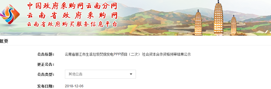 中國環(huán)聯網獲悉,12月6日,云南省麗江市生活垃圾焚燒發(fā)電PPP項目(二次) 社會資本合作資格預審結果公示出爐。資格預審入圍單位包括康恒環(huán)境、北京環(huán)境、中國環(huán)保、三峰環(huán)境等,具體名單如下(排名不分先后):此前,該項目已經經歷過兩次招標和一次流標,中國環(huán)聯網帶大家回顧下項目進展。8月31日,該項目發(fā)布招...