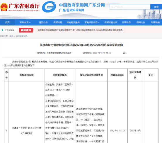 圖片來源:廣東省政府采購廣東省政府采購網(wǎng)消息,近日,英德市城市管理和綜合執(zhí)法局發(fā)布2022年08月至2022年10月政府采購意向,英德市“互聯(lián)網(wǎng)+城鄉(xiāng)環(huán)衛(wèi)一體化”PPP項(xiàng)目計劃于2022年10月份開展政府采購。采購需求概況:1.環(huán)衛(wèi)作業(yè)設(shè)備周期更新,按服務(wù)范圍增加投入專業(yè)環(huán)衛(wèi)設(shè)備(包括但不限于高壓清...