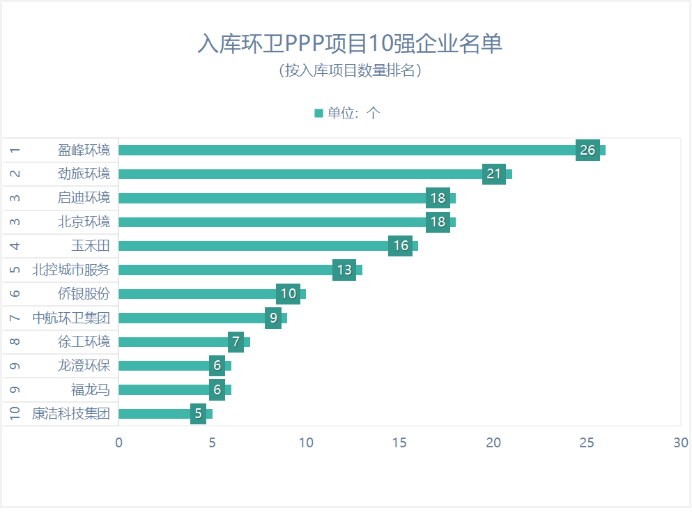 已入庫環(huán)衛(wèi)PPP項(xiàng)目領(lǐng)域,誰是最大贏家?入庫項(xiàng)目:財政部政府和社會資本合作中心PPP項(xiàng)目庫可以查詢到的項(xiàng)目,包括項(xiàng)目管理庫和項(xiàng)目儲備清單。截止目前,已入庫、且已開標(biāo)的環(huán)衛(wèi)PPP項(xiàng)目總量為302個。按項(xiàng)目量計算,盈峰環(huán)境占入庫項(xiàng)目總量的12%在302個入庫且已開標(biāo)環(huán)衛(wèi)PPP項(xiàng)目中,盈峰環(huán)境入庫項(xiàng)目數(shù)量...