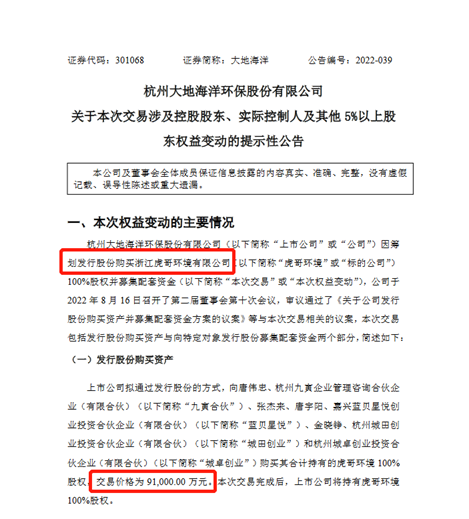 生活垃圾分類回收“藍(lán)?!闭絹碓蕉嘤袑?shí)力的公司競逐。8月17日,大地海洋(301068.SZ)披露重大資產(chǎn)重組草案,公司擬通過發(fā)行股份的方式,向唐偉忠、九寅合伙、張杰來、唐宇陽、藍(lán)貝星悅、金曉錚、城田創(chuàng)業(yè)和城卓創(chuàng)業(yè)購買其合計持有的虎哥環(huán)境100%股權(quán),交易價格為9.1億元;同時擬向合計不超過35...