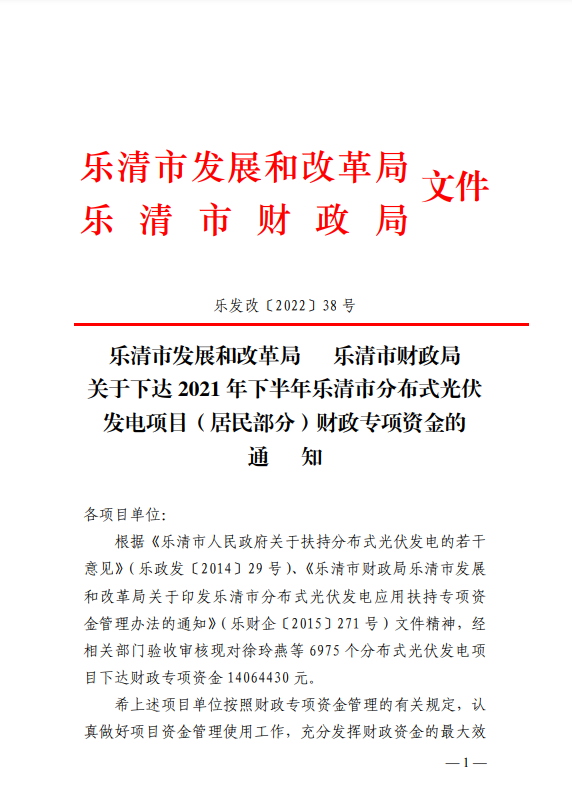 近日,浙江省樂清市發(fā)展和改革局發(fā)布《關(guān)于下達2021年下半年樂清市分布式光伏發(fā)電項目(居民部分)財政專項資金的通知》。詳情如下: 各項目單位: 根據(jù)《樂清市人民政府關(guān)于扶持分布式光伏發(fā)電的若干意見》(樂政發(fā)〔2014〕29號)、《樂清市財政局樂清市發(fā)展和改革局關(guān)于印發(fā)樂清市分布式光伏發(fā)電應(yīng)用扶持專項...