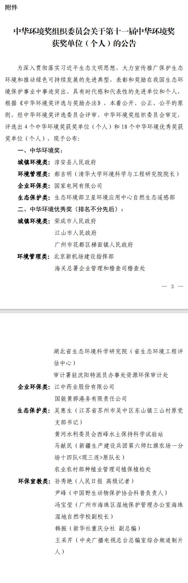 關(guān)于公布第十一屆中華環(huán)境獎評選結(jié)果的通知 國務(wù)院各有關(guān)部門辦公廳(室),各省、自治區(qū)、直轄市和計劃單列市生態(tài)環(huán)境廳(局): 為深入貫徹落實(shí)習(xí)近平生態(tài)文明思想,大力宣傳推廣保護(hù)生態(tài)環(huán)境和推動綠色可持續(xù)發(fā)展的先進(jìn)典型,堅決打好污染防治攻堅戰(zhàn),建設(shè)美麗中國,促進(jìn)人與自然和諧共生,由全國人大環(huán)資委、全國政協(xié)...