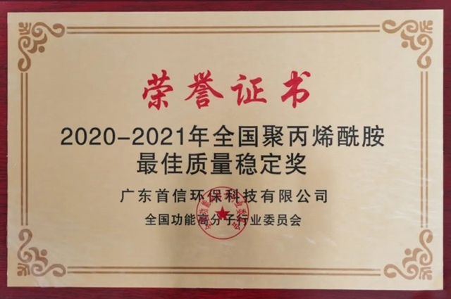 2020-2021年全國聚丙烯酰胺最佳質(zhì)量穩(wěn)定獎已出爐,本次獲得該項榮譽的是——廣東首信環(huán)保材料科技有限公司??上?、可賀、更可嘆!首信環(huán)保獲全國聚丙烯酰胺最佳質(zhì)量穩(wěn)定獎 事實上,廣東首信環(huán)保材料科技有限公司(下稱“首信環(huán)保”)已經(jīng)不是第一次獲得該項榮譽...
