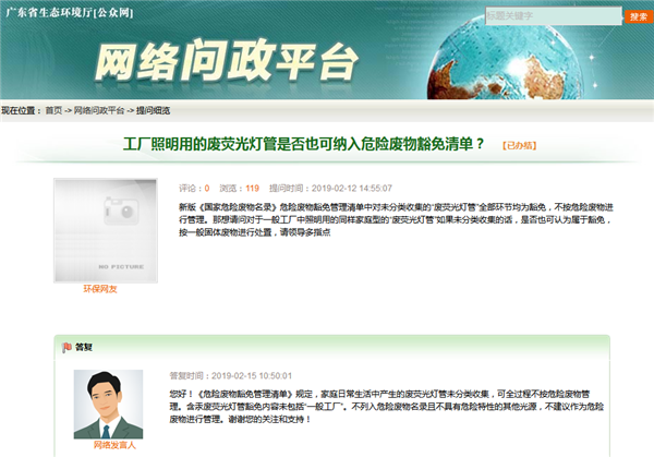 提問(wèn):新版《國(guó)家危險(xiǎn)廢物名錄》危險(xiǎn)廢物豁免管理清單中對(duì)未分類收集的“廢熒光燈管”全部環(huán)節(jié)均為豁免,不按危險(xiǎn)廢物進(jìn)行管理。那想請(qǐng)問(wèn)對(duì)于一般工廠中照明用的同樣家庭型的“廢熒光燈管”如果未分類收集的話,是否也可認(rèn)為屬于豁免,按一般固體廢物進(jìn)行處置,請(qǐng)領(lǐng)導(dǎo)多指點(diǎn)。答復(fù):您好!《危險(xiǎn)廢物豁免管理清單》規(guī)定,家...