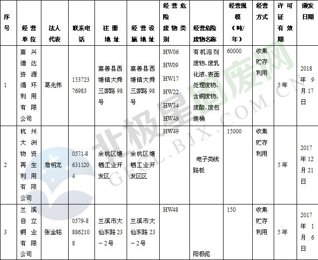 本文整理了浙江省截止至2019.1.22的危險廢物經營單位,詳情如下: