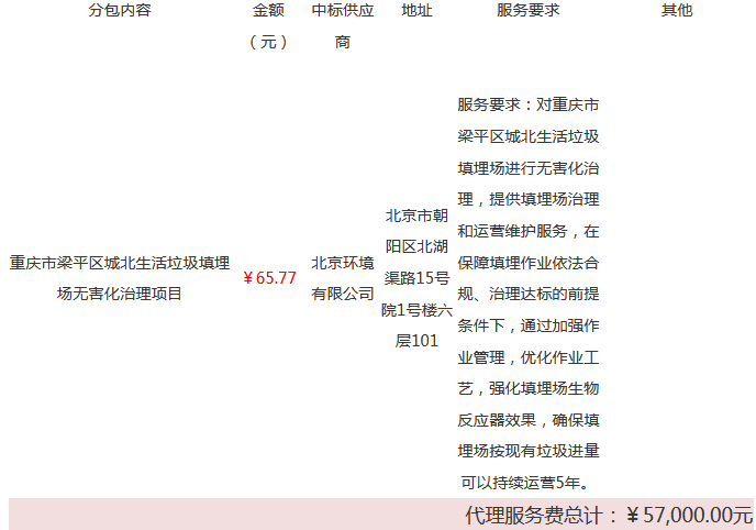 重慶市梁平區(qū)城北生活垃圾填埋場無害化治理項目(19C0015)結果公告發(fā)布日期: 2019年2月1日一、項目號:19C0015二、項目名稱:重慶市梁平區(qū)城北生活垃圾填埋場無害化治理項目三、采購方式:公開招標四、評審日期: 2019年1月31日五、公告日期: 2019年2月1日六、中標結果分包號:1七...