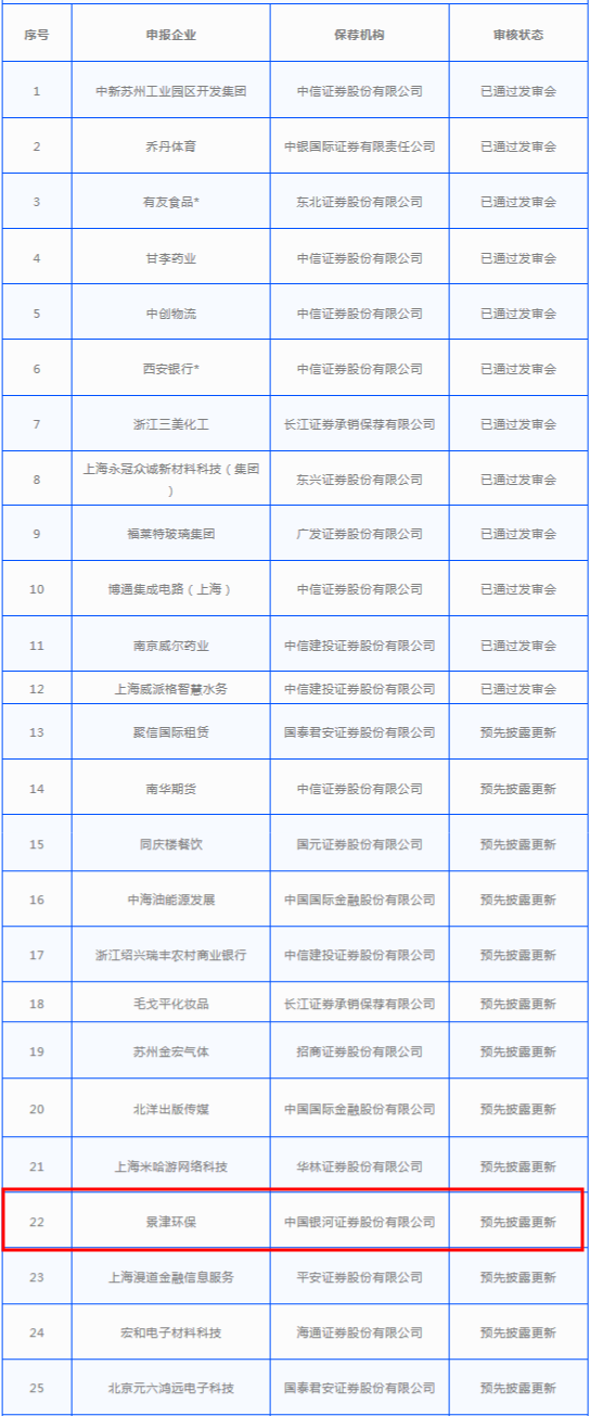 導(dǎo)語:截至2019年1月3日,中國證監(jiān)會(huì)受理首發(fā)及發(fā)行存托憑證企業(yè)300家,其中已過會(huì)32家,未過會(huì)268家。未過會(huì)企業(yè)中正常待審企業(yè)261家,中止審查企業(yè)7家。其中包含多家環(huán)保企業(yè),涉及再生資源、垃圾發(fā)電、環(huán)衛(wèi)服務(wù)等領(lǐng)域。具體信息如下:上交所主板首次公開發(fā)行股票正常審核狀態(tài)企業(yè)基本信息情況表 截至...