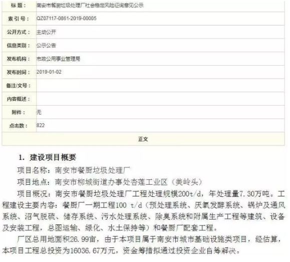 2019年1月2日,南安市政公用事業(yè)管理局發(fā)布兩份《社會(huì)穩(wěn)定風(fēng)險(xiǎn)征詢意見公示》,主要內(nèi)容關(guān)于南安市生活垃圾焚燒發(fā)電廠提級改造,以及南安市餐廚垃圾處理廠建設(shè)兩項(xiàng)工程。具體如下:南安市生活垃圾焚燒發(fā)電廠提級改造工程項(xiàng)目位于柳城街道杏蓮工業(yè)區(qū)(美嶺頭),提級改造后日處理垃圾量將達(dá)到每日1500噸,年處理量...
