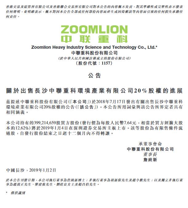 中聯(lián)重科發(fā)布公告,就此前有關(guān)出售長沙中聯(lián)重科環(huán)境產(chǎn)業(yè)有限公司20%股權(quán),公司持有的3.99億股買方盈峰環(huán)境股份(發(fā)行價為每股人民幣7.64元,相當于買方經(jīng)擴大股本約12.62%)將于2019年1月4日在深圳證券交易所主板上市。該等股份為有限售條件流通股,自發(fā)行股份結(jié)束之日起12個月內(nèi)不得轉(zhuǎn)讓。原標題...