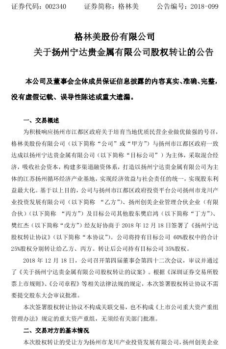12月18日,格林美發(fā)布公告,公司將持有揚州寧達貴金屬有限公司60%股權中的合計25%股權分別轉讓給揚州市江都區(qū)政府投資平臺公司揚州市龍川產(chǎn)業(yè)投資發(fā)展有限公司、揚州創(chuàng)美企業(yè)管理合伙企業(yè)(有限合伙)。轉讓后公司持有目標公司35%股權。揚州寧達貴金屬有限公司主要從事鍺金屬回收、工業(yè)固體廢棄物填埋、電子廢...