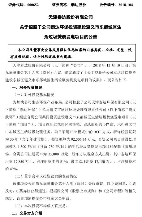 日前,泰達環(huán)保發(fā)布公告,公司控股子公司天津泰達環(huán)保有限公司(以下簡稱“泰達環(huán)?!保M與遵義市欣環(huán)垃圾處理有限責任公司(以下簡稱“遵義欣環(huán)”)組建合資公司共同投資建設遵義市東部城區(qū)生活垃圾焚燒發(fā)電項目(以下簡稱“項目”)。項目選址紅花崗區(qū)深溪鎮(zhèn),占地面積約 147 畝,承擔遵義市中心城區(qū)生活垃圾處理任...