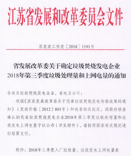 日前,江蘇發(fā)改委發(fā)布關于確定垃圾焚燒發(fā)電企業(yè)2018年第三季度垃圾處理量和上網(wǎng)電量的通知,詳情如下: