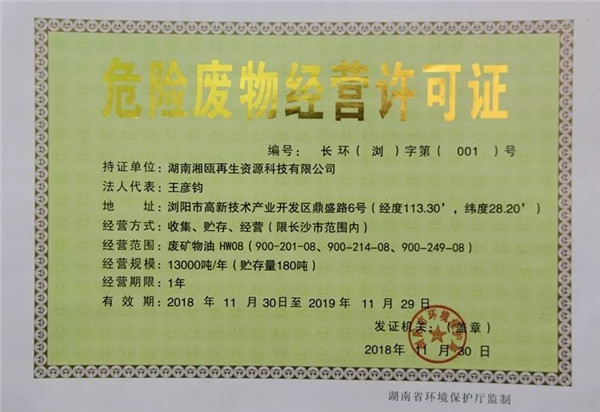 2018年11月15日,湖南湘甌再生資源科技有限公司向瀏陽市環(huán)保局申請發(fā)放廢礦物油危險廢物的收集許可證,申請年收集總量1.3萬噸。經(jīng)專家評審,公示公開,湖南湘甌再生資源科技有限公司選址符合相關要求,申請《危險廢物經(jīng)營許可證》材料齊全。按照《危險廢物經(jīng)營許可證管理辦法》等文件規(guī)定,該公司符合廢礦物油(HW08)收集許可證的申請條件。11月30日,瀏陽市環(huán)境保護局向湖南湘甌再生資源科技有限公司發(fā)放了瀏陽市第一本《危險廢物經(jīng)營許可證》。