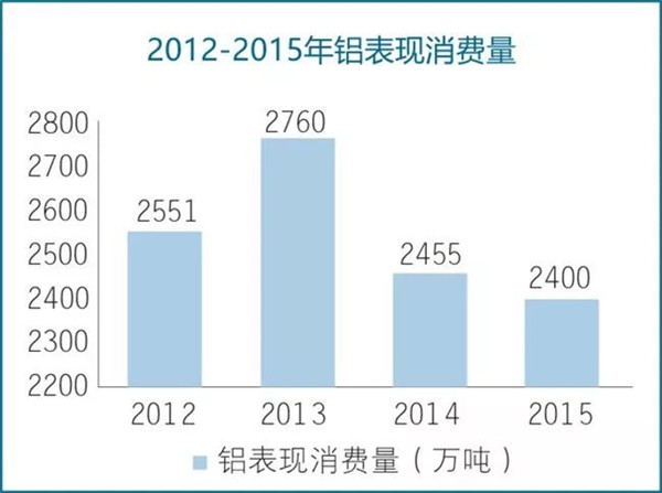 2015年全球原鋁需求為5,771萬噸,較2014年上升386.9萬噸。2015年全球原鋁產量增加410.3萬噸。中國區(qū)域鋁表觀消費者由2012年的2551萬噸下降到2015年的2400萬噸。