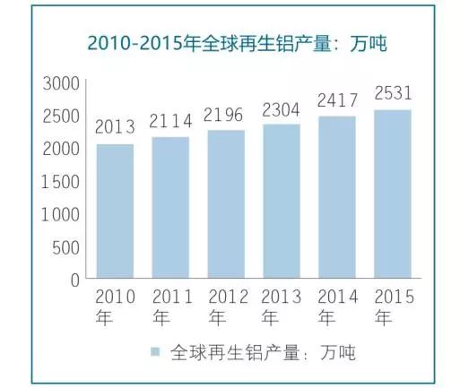 2010年全球再生鋁產量為2013萬噸,2015年增長至2531萬噸。