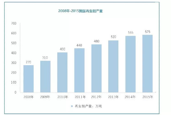 2008年中國再生鋁產量為270萬噸,近年來由于有道國家宏觀調控,各種能源可再生政策發(fā)布,以及我國“十二五”和“十三五”可持續(xù)發(fā)展的要求,我國鋁再生產業(yè)發(fā)展速度,2015年再生鋁產量達到了575萬噸,同時鋁再生平均增長率達到12.3%。