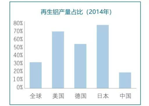 發(fā)達國家的再生鋁產量已經普遍超過原鋁產量。根據USGS的統(tǒng)計數據,2014年美國再生鋁產量為364萬噸,而原鋁產量僅為171萬噸,再生鋁產量占總產量的68%,日本2014 年的再生鋁產量占總產量的76%。