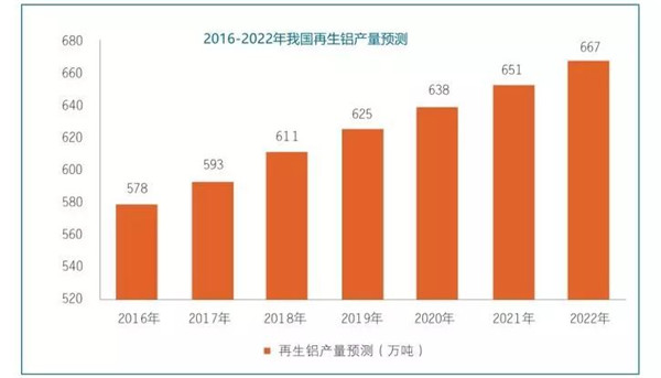 近年來,經濟發(fā)展突飛猛進,隨之而來的便是節(jié)約資源、保護環(huán)境等要求,中國再生鋁企業(yè)受益迅速成長。2008年,再生鋁產量達到270萬噸,至2015達到575萬噸。由于受到國內鋁市供需不平衡的影響,近幾年鋁價下降維持平穩(wěn),局部小反彈,大多數再生鋁企業(yè)利潤提升,再生鋁行業(yè)未來前景開始回升。按照2006年到2015再生鋁的增長趨勢,預計2016再生鋁產量達到578萬噸,2022年再生鋁產量達到667萬噸。
