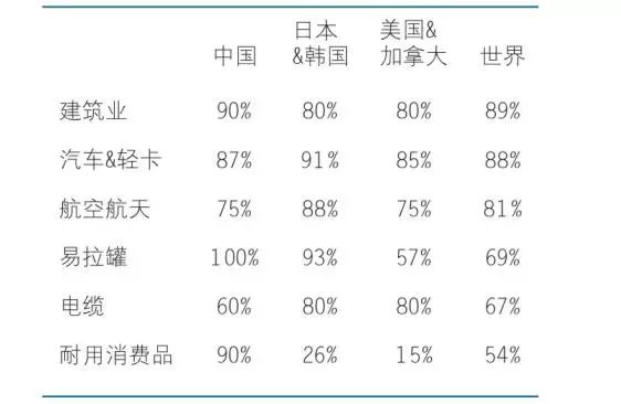 下表是我國與其他國家廢鋁回收率情況對比: