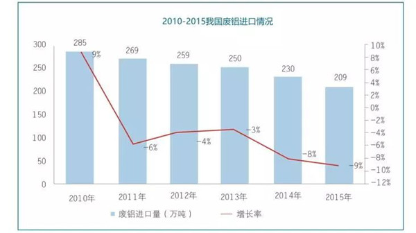 中國鋁儲存量雖然多,但是我國可持續(xù)發(fā)展戰(zhàn)略要鋁資源是需要循環(huán)利用的,所以我國不但國內回收廢鋁,每年還會進口回收國外的廢鋁,2010年我國廢鋁進口285萬噸,同比增長9%。2015年我國進口廢鋁209萬噸,同比下降9%。