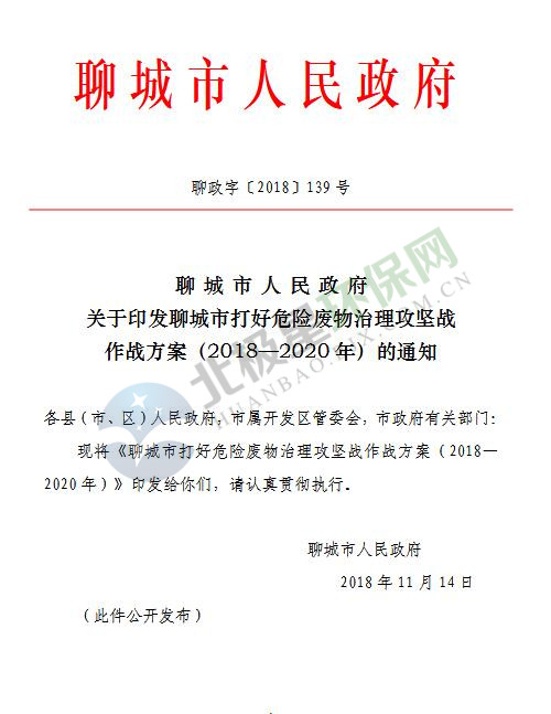 日前,山東省聊城市印發(fā)《聊城市打好危險廢物治理攻堅戰(zhàn)作戰(zhàn)方案(2018—2020年)》,詳情如下: