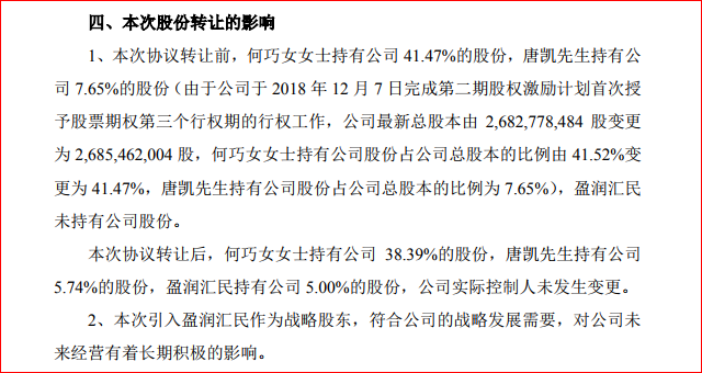 根據(jù)協(xié)議,何巧女將其持有的公司股份 82,935,718 股(占公司總股本的 3.09%)、唐凱將其持有的公司股份 51,337,383 股(占公司總股本的 1.91%),共計 134,273,101 股(占公司總股本的 5.00%)轉(zhuǎn)讓給盈潤匯民。