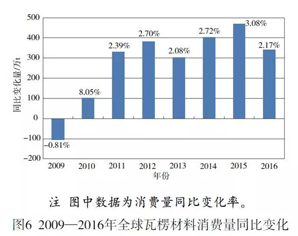 隨著全球經(jīng)濟的發(fā)展以及人們生活水平的不斷提高,具有綠色環(huán)保及成本效益優(yōu)勢的包裝紙及紙板等紙質(zhì)包裝材料的需求量保持持續(xù)增長。其中,包裝紙及紙板產(chǎn)品結(jié)構(gòu)中占比達70% 的瓦楞材料(瓦楞原紙和箱紙板),在全球紙及紙板產(chǎn)量中的占比高達40%。2016 年全球瓦楞材料生產(chǎn)量16144萬t,比2015 年增長2.31%,占全球紙及紙板總生產(chǎn)量的39.29% ; 消費量16083 萬t, 比2015 年增長2.17%,占全球紙及紙板總消費量的38.89%。目前全球的瓦楞材料產(chǎn)品的纖維原料結(jié)構(gòu)中,廢紙漿的占比高達80%。因此,受瓦楞材料需求持續(xù)增長影響(見圖6),未來全球廢紙需求量仍將持續(xù)增加;其次,一些國家為了節(jié)約資源、保護環(huán)境,不斷加大廢紙利用力度,尤其是中國、印度、泰國、印度尼西亞、越南等發(fā)展中國家和地區(qū)廢紙需求量近年快速增加。
