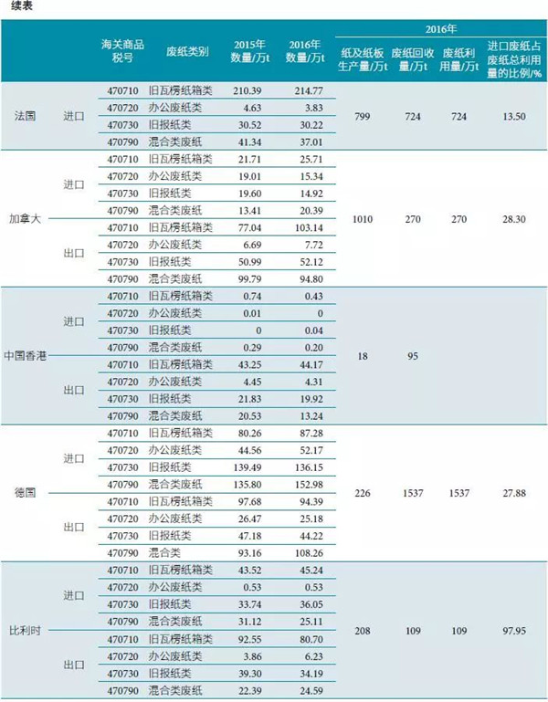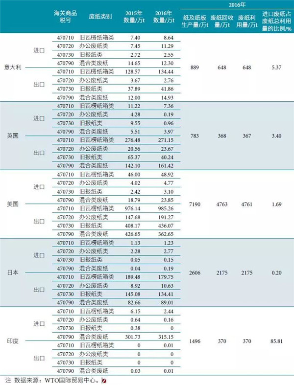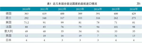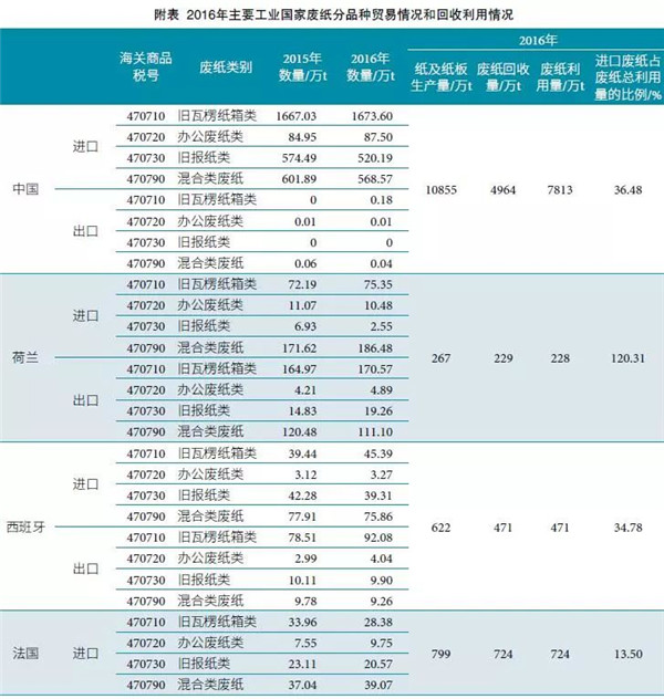 美國、日本、德國、荷蘭、英國等發(fā)達國家都十分重視廢紙的資源化利用,根據(jù)需要,每年會不同程度地進口一定數(shù)量的廢紙(見表1)。其中,花園式國家荷蘭,每年的廢紙進口量基本都在300 萬t 左右,從數(shù)量上相當(dāng)于其紙及紙板的生產(chǎn)幾乎全部使用進口廢紙。附表列出了2016 年主要工業(yè)國家廢紙分品種貿(mào)易情況和回收利用情況。