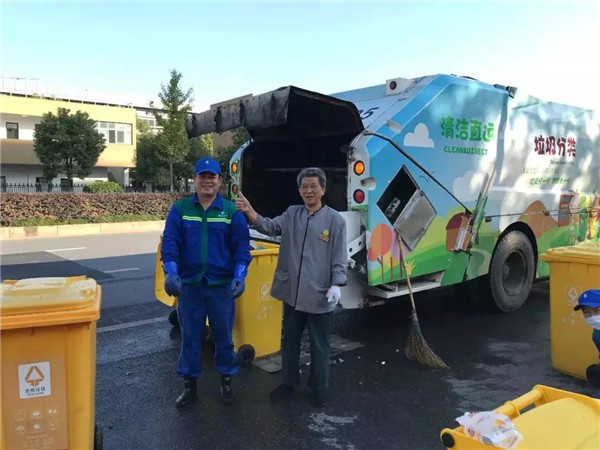 8點(diǎn)30分,龔磊來(lái)到了第三車(chē)的第一個(gè)作業(yè)點(diǎn),丁橋陽(yáng)光翡麗灣。這個(gè)時(shí)間點(diǎn),上班的上班,上學(xué)的上學(xué)。小區(qū)保潔員過(guò)來(lái)把已經(jīng)清空的垃圾桶拖回小區(qū)集置點(diǎn),保潔大伯不斷夸著這兩個(gè)年輕人干活利索,態(tài)度又好,非得跟龔磊來(lái)了一張難得的合影并豎起了大拇指,而龔縵琴害羞地躲開(kāi)去拉桶了。