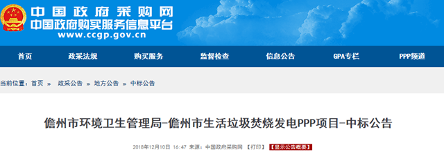 2018年12月10日,海南省儋州市生活垃圾焚燒發(fā)電PPP項(xiàng)目發(fā)布中標(biāo)公告,中國光大國際有限公司成為中標(biāo)的社會資本方,垃圾處理服務(wù)費(fèi)76元/噸。