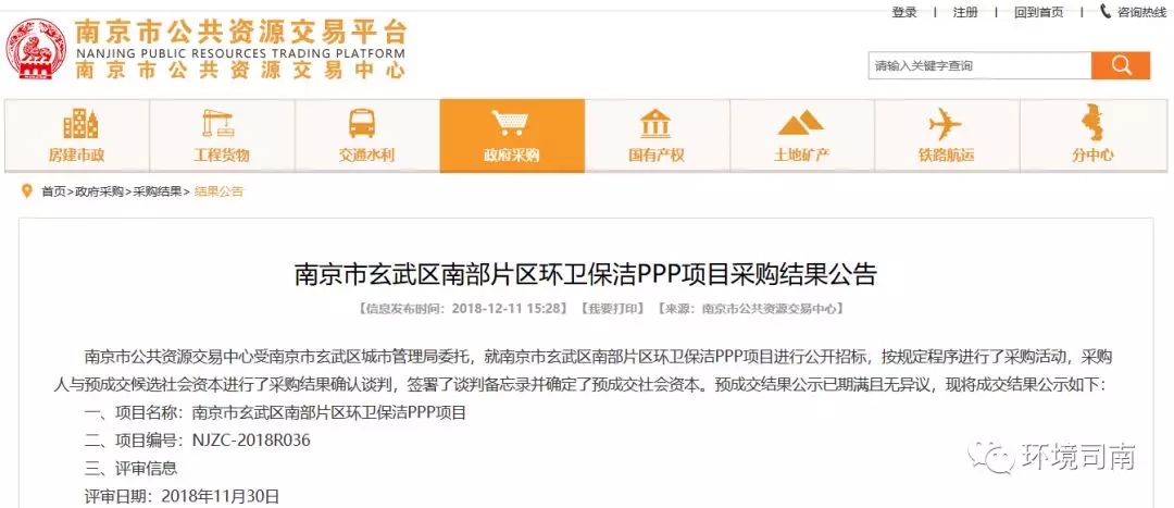南京市玄武區(qū)南部片區(qū)環(huán)衛(wèi)保潔PPP項(xiàng)目中標(biāo)結(jié)果