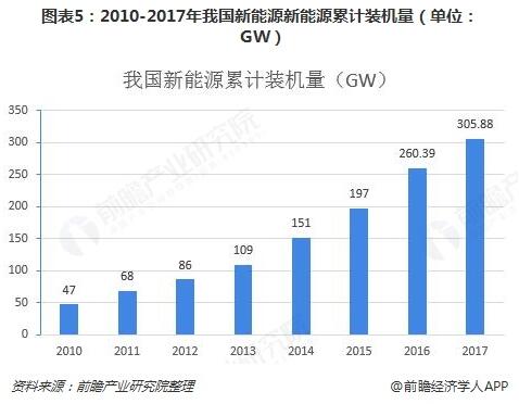 在各項政策發(fā)布后,新能源行業(yè)快速發(fā)展,下面我們來看中國新能源的發(fā)展情況。2010-2017年,我國新能源累計裝機量呈不斷上漲趨勢,2017年我國新能源累計裝機已經(jīng)達到305.88GW(新能源累計裝機量由光伏、風(fēng)電、生物質(zhì)加總)。目前中國在光伏、風(fēng)電以及生物質(zhì)能方面的發(fā)展,已經(jīng)處于世界領(lǐng)先水平,各項累計裝機均處于世界前三。