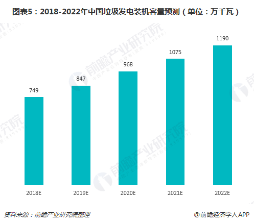 另一方面,垃圾焚燒發(fā)電尚處于快速發(fā)展時期。在此期間,垃圾焚燒發(fā)電行業(yè)進入可持續(xù)現代化發(fā)展軌道,大型專業(yè)化企業(yè)引領行業(yè)發(fā)展,行業(yè)集中度逐步提高,形成較大的行業(yè)規(guī)模。根據預測,2018-2022年,垃圾發(fā)電裝機容量年均復合增長率約為12.27%,預計到2022年中國垃圾發(fā)電裝機容量將達到1190萬千瓦。