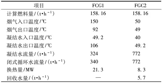 系統(tǒng)設(shè)計參數(shù)如表2所示。煙氣流經(jīng)第一級煙氣冷卻器FGC1后,煙溫由150℃降至92℃。脫硫塔出口為50℃的飽和煙氣經(jīng)煙氣冷卻器FGC2后被冷卻至49.2℃。全部的凝結(jié)水以772t/h的流量流入FGC2板式換熱器后,溫度由40℃升至49.2℃,隨后凝結(jié)水分為兩路,凝結(jié)水以324t/h進入FGC1的板式換熱器加熱至106℃進入6號低壓加熱器,其余的直接進入8號低壓加熱器。煙氣冷卻器FGC1和FGC2的閉式循環(huán)水流量分別為340,772t/h。系統(tǒng)設(shè)計的回收水量為5.7t/h。