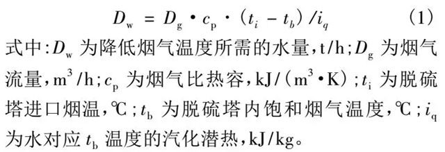 電站鍋爐的設(shè)計排煙溫度一般在120℃左右,但實際運行時往往高于這個數(shù)值。在圖1所示的煙氣流程中,鍋爐的排煙經(jīng)脫硫塔噴淋脫硫、除霧脫水后溫度約為50℃,從脫硫塔排出。脫硫塔內(nèi)消耗的水量可根據(jù)脫硫塔內(nèi)煙氣的能量平衡計算,見式(1):