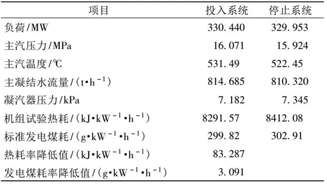 在330MW工況下分別在系統(tǒng)投入和停止的情況下,對機組進行了性能試驗,主要數(shù)據(jù)見表4。