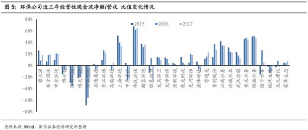 PPP帶動(dòng)投資性現(xiàn)金流支出的大幅提升使得環(huán)保企業(yè)現(xiàn)金流緊張。從經(jīng)營(yíng)性現(xiàn)金流來(lái)看,雖然近年來(lái)環(huán)保企業(yè)營(yíng)收和利潤(rùn)大幅增長(zhǎng),經(jīng)營(yíng)性現(xiàn)金流有所改善,但經(jīng)營(yíng)性現(xiàn)金流的增長(zhǎng)卻趕不上營(yíng)收和利潤(rùn)的增速。現(xiàn)金回流成為業(yè)績(jī)高速增長(zhǎng)的環(huán)保行業(yè)的一大痛點(diǎn)。環(huán)保板塊整體經(jīng)營(yíng)性現(xiàn)金流凈額的增速?gòu)?015年開(kāi)始顯著下降,而對(duì)應(yīng)的凈利潤(rùn)增速卻同年顯著上升。到2017年,環(huán)保板塊整體經(jīng)營(yíng)性現(xiàn)金流凈額出現(xiàn)了-22.7%的負(fù)增長(zhǎng)。
