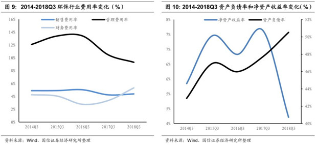 從整體來(lái)看:環(huán)保板塊2018年前三季度營(yíng)收、凈利潤(rùn)分別同比+6.1%、-24.0%,營(yíng)收增速同比明顯下滑,凈利潤(rùn)大幅度負(fù)增長(zhǎng)。2018年前三季度,59家環(huán)保上市公司共實(shí)現(xiàn)營(yíng)業(yè)收入1629.7億元,同比增長(zhǎng)6.1%;共實(shí)現(xiàn)凈利潤(rùn)143.7億元,同比下滑24.0%。板塊整體毛利率28.32%,同比下滑0.57pct;凈利率9.00%,同比下滑3.71pct,主要原因是資金面緊張,環(huán)保公司財(cái)務(wù)成本大幅度增加。與去年同期(營(yíng)收+38.8%、凈利潤(rùn)37.1%)相比,2018年前三季度環(huán)保板塊營(yíng)收、凈利潤(rùn)增速下滑明顯,特別是凈利潤(rùn)出現(xiàn)大幅度的負(fù)增長(zhǎng)。