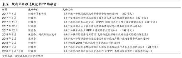 2018年下半年以來(lái),PPP項(xiàng)目的清查告一段落。在中央政治局會(huì)議強(qiáng)調(diào)“六個(gè)穩(wěn)”后,發(fā)改委要求加快推進(jìn)基建投資,基建補(bǔ)短板的功能越發(fā)重要。2018年10月31日國(guó)務(wù)院發(fā)布《關(guān)于保持基礎(chǔ)設(shè)施領(lǐng)域補(bǔ)短板力度的指導(dǎo)意見(jiàn)》明確表示,對(duì)經(jīng)核查符合規(guī)定的PPP項(xiàng)目加大推進(jìn)力度,積極推動(dòng)符合條件項(xiàng)目發(fā)行債券、規(guī)范開(kāi)展資產(chǎn)證券化。PPP被認(rèn)為是進(jìn)一步加大投入的重要推動(dòng)力,主管部門(mén)也為下一步PPP的發(fā)展做了相應(yīng)的規(guī)范和準(zhǔn)備: