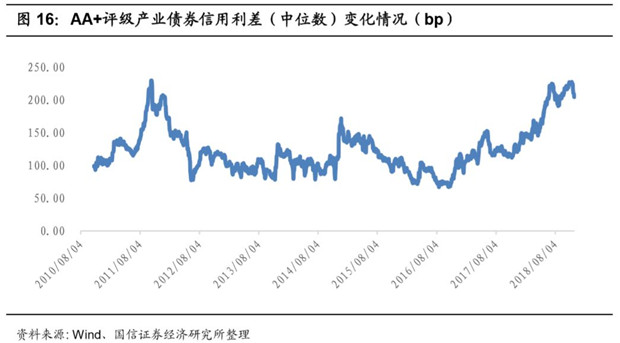 整個(gè)市場(chǎng)債券的信用利差已出現(xiàn)下降的趨勢(shì)。AA+評(píng)級(jí)的債券(大部分優(yōu)質(zhì)環(huán)保公司的債券評(píng)級(jí),包括碧水源、東方園林等)的信用利差從4月份開(kāi)始快速攀升,顯示了市場(chǎng)資金對(duì)于發(fā)債企業(yè)的償還能力的擔(dān)憂(yōu)。最高信用利差達(dá)到了225bp左右,目前已經(jīng)出現(xiàn)了下降的趨勢(shì)。