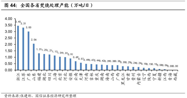 從垃圾焚燒產(chǎn)能分部來(lái)看,浙江、江蘇、廣東三省垃圾焚燒產(chǎn)能超過(guò)3萬(wàn)噸/日,甘肅、貴州、內(nèi)蒙古、遼寧、陜西、寧夏、新疆、江西 8 省垃圾焚燒產(chǎn)能不足 3000 噸/日,而青海和西藏更是尚無(wú)垃圾焚燒項(xiàng)目。