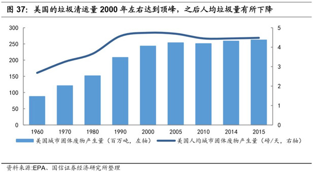 從上世紀(jì)60年代開(kāi)始,美國(guó)城市的固體廢物產(chǎn)生量開(kāi)始以年化1.5%的速度快速增長(zhǎng)了40年,總固廢產(chǎn)生量從1960年的8800萬(wàn)噸增長(zhǎng)到2000年的2.5億噸,而人均固廢產(chǎn)生量也從2.68磅/天增加到了4.75磅/天。美國(guó)的垃圾清運(yùn)量2000年左右達(dá)到頂峰,之后由于回收比例的提升和人們環(huán)保意識(shí)的增長(zhǎng),人均垃圾量有所下降,到2015年美國(guó)人均產(chǎn)生4.5磅/天左右的固體廢棄物。