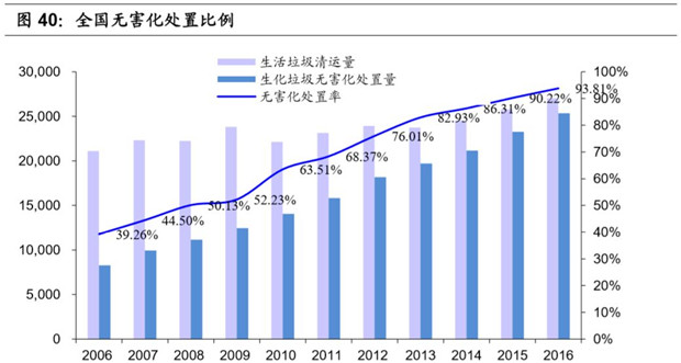 從生活垃圾無(wú)害化處置率來(lái)看,我國(guó)近十年城市生活垃圾清運(yùn)量與無(wú)害化處理率穩(wěn)步上升。2016年,全國(guó)城鎮(zhèn)生活垃圾無(wú)害化處置能力約 81.20 萬(wàn)噸/日,對(duì)應(yīng)年處理量 2.53 億噸,無(wú)害化處置率 93.81%,其中設(shè)市城市96.62%,縣城85.22%。 從處理量細(xì)分來(lái)看,2016年無(wú)害化處置中填埋、焚燒、其他方式年處置量分別為 1.68 億噸、0.80 億噸、0.06 億噸,占比分別為 66%、31%和 2%,衛(wèi)生填埋在無(wú)害化處置中占比最高。