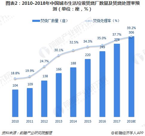 2017年,我國城市生活垃圾焚燒處理量已達(dá)到7589萬噸,同比增長2.86%;此外,焚燒垃圾場數(shù)量從2010年的104座增加至2017年的278座,焚燒處理率由2010年的18.8%提高至37.7%。