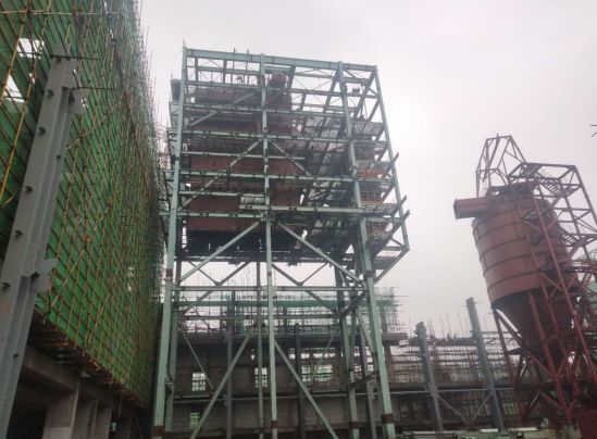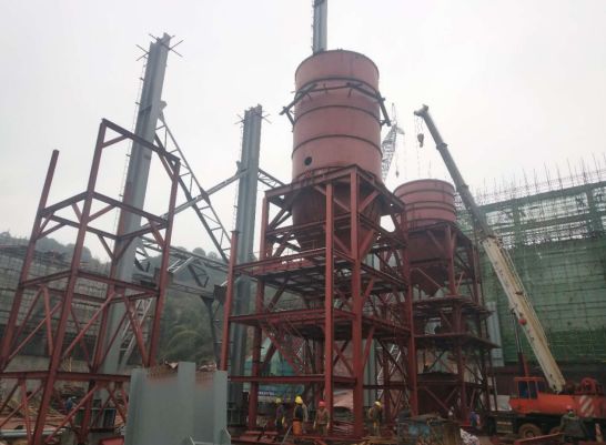 2、煙氣處理:消石灰、灰?guī)靷}體安裝就位,樓梯欄桿安裝;