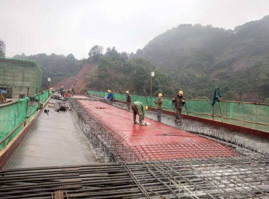 1、垃圾進(jìn)廠橋1-2跨模板制安,3-4跨箱梁澆筑全部完成,5-6跨鋼筋綁扎完成;