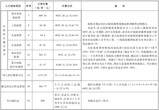 (二)環(huán)衛(wèi)用工成本指導(dǎo)價(jià)包括基礎(chǔ)工資、環(huán)衛(wèi)崗位津貼、環(huán)衛(wèi)工人工齡工資、高溫津貼、加班或者延長(zhǎng)工作時(shí)間工資、國家法定節(jié)日和市環(huán)衛(wèi)工人節(jié)慰問金、社會(huì)保險(xiǎn)(單位繳納部分)、住房公積金(單位繳納部分)8個(gè)部分,其他項(xiàng)目按照現(xiàn)有的法律、法規(guī)執(zhí)行。