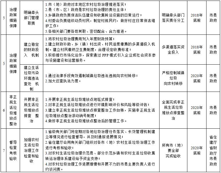 (一)制定農(nóng)村生活垃圾治理方案。各市(地)、縣(市、區(qū))要結(jié)合實際,堅持按照“統(tǒng)籌考慮、分類指導、經(jīng)濟適用、保證效果”的原則,制定本地區(qū)農(nóng)村生活垃圾治理三年行動方案。方案要重點確定農(nóng)村生活垃圾處理目標任務(wù)、資金投入、責任部門和保障措施,合理選擇收運處置模式和技術(shù)路線,明確各階段垃圾治理工作重點,細化年度建設(shè)任務(wù)。各縣(市、區(qū))制定方案后,要組織編制本地區(qū)農(nóng)村生活垃圾治理設(shè)施建設(shè)專項規(guī)劃方案,充分考慮空間居民點布局調(diào)整和環(huán)境影響因素,科學確定整治村范圍、收集轉(zhuǎn)運處理設(shè)施布局和建設(shè)規(guī)模,并經(jīng)專家論證通過后實施。各市縣《農(nóng)村生活垃圾治理方案》于2019年3月底前報省住建廳備案。