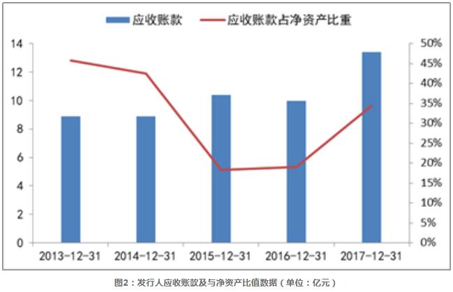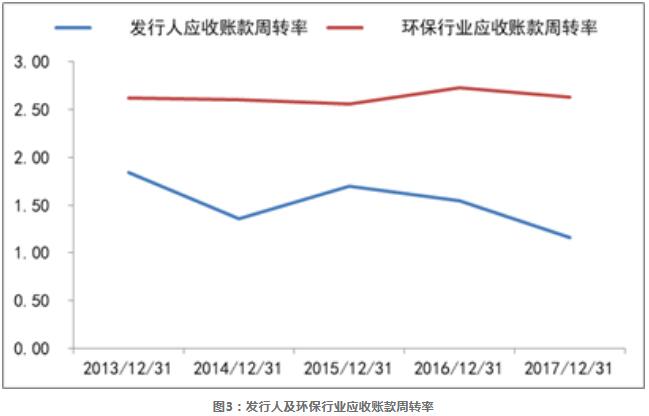 另一方面,從發(fā)行人違約前的近5年應(yīng)收賬款數(shù)據(jù)來看,如圖2所示,2013年到2017年,發(fā)行人的應(yīng)收賬款規(guī)模不斷增加,由8.91億元增長到了13.39億元,其與凈資產(chǎn)的比值在發(fā)行人戰(zhàn)略轉(zhuǎn)型前的2013-2015年區(qū)間不斷下降,但轉(zhuǎn)型后該比值卻一路上升,由2015年的18.37%增長到了2017年的34.40%;應(yīng)收賬款年周轉(zhuǎn)率2015年后也不斷下滑,從1.70降到了1.16,發(fā)行人的應(yīng)收賬款周轉(zhuǎn)率數(shù)據(jù)弱于環(huán)保行業(yè)整體水平。同時,根據(jù)發(fā)行人2018半年報中數(shù)據(jù),截至2018年6月底發(fā)行人處于施工期BOT訂單11個,未完成投資額37.72億元,尚未執(zhí)行的訂單27個,擬投資金額為30.55億元,發(fā)行人未來的投資需求較大,資金壓力較大。